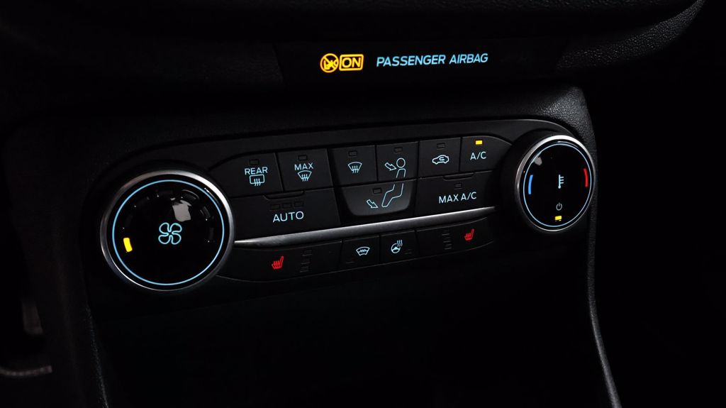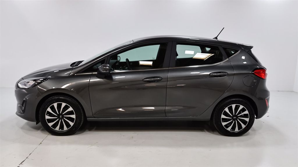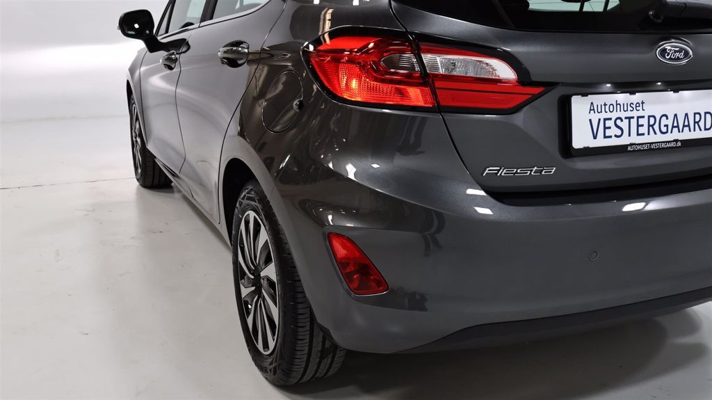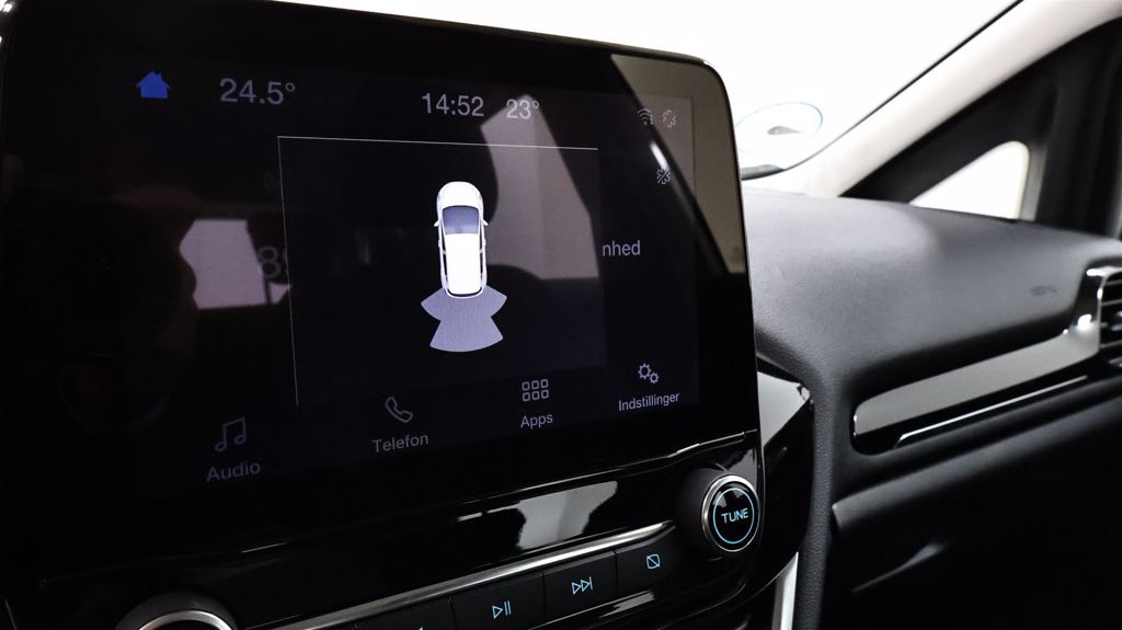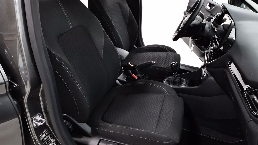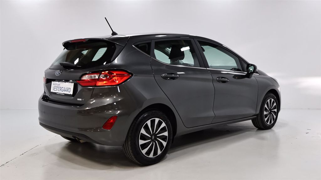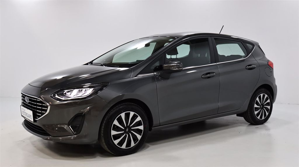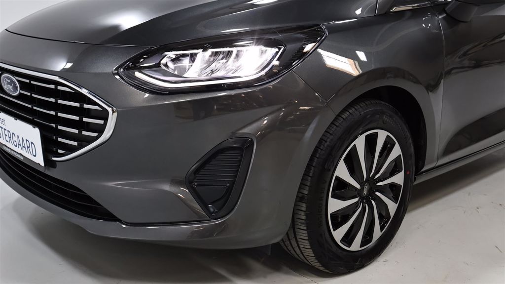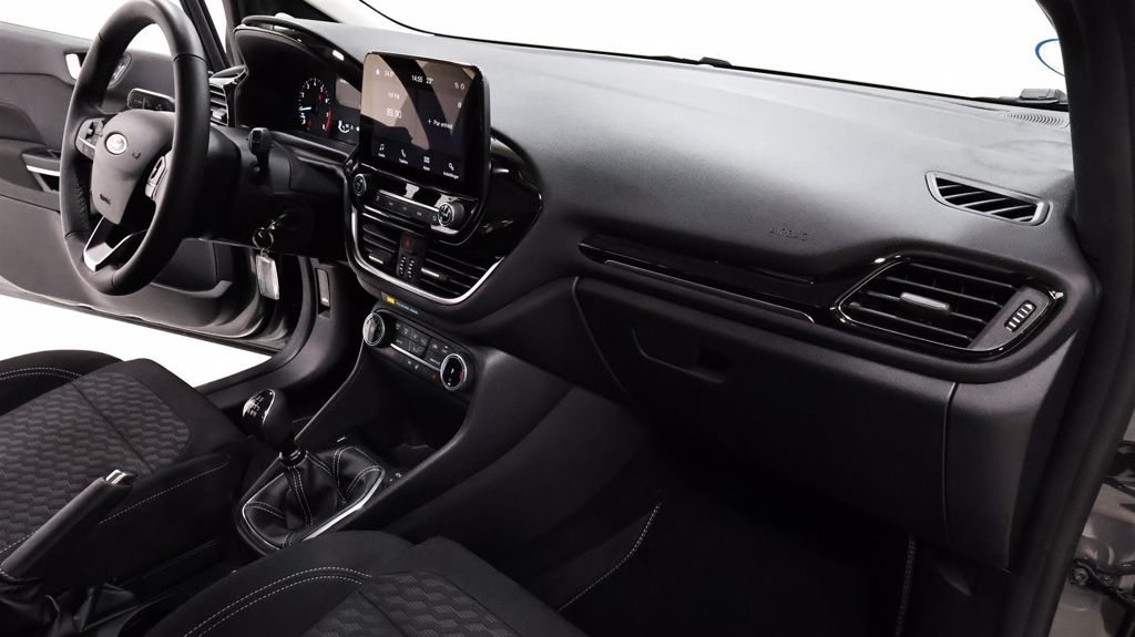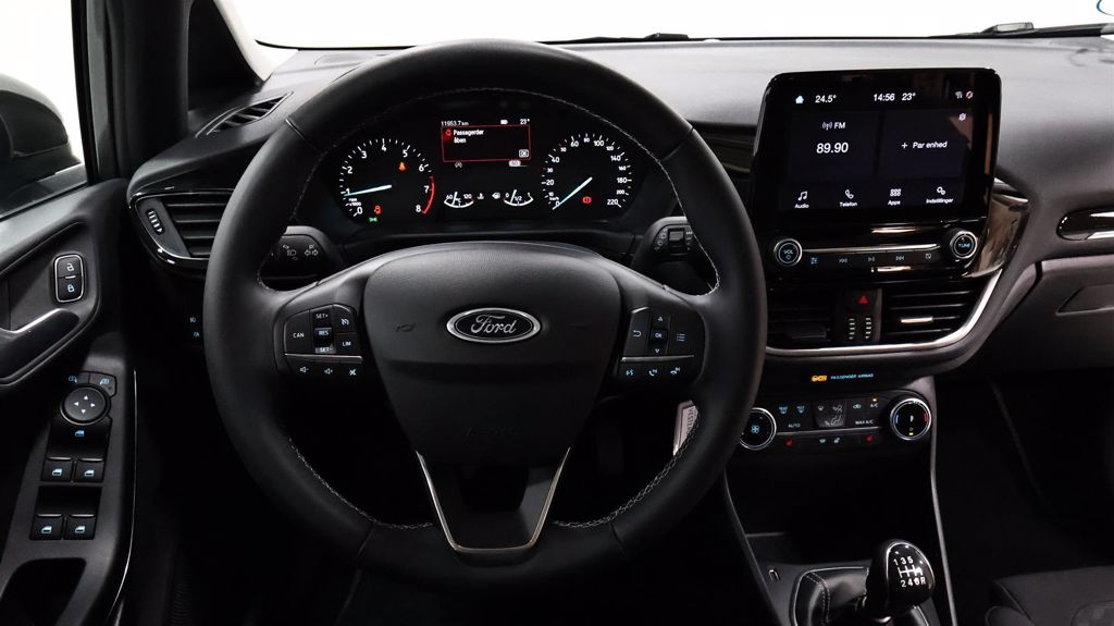 Standard udstyr i Fiesta Titanium: 8" Toucscreen med Ford SYNC2.5 (Indeholder Apple CarPlay, Android Auto, Klimaanlæg, opvarmet rat. Parkeringssensor bag. Bluetooth med automatisk nødopkald, USB-indgang), Lane Keeping Aid og Assist (vognbane assistent), læderbetrukke opvarmet t rat, armlæn, opvarmede sidespejle, opvarmet forrude, fjernbetjent centrallås, tripcomputer, dæktryksovervågning, el-ruder for og bag, 7 airbags, start/stop-system, automatisk lygtetænding, 7 airbags, ESP, ABS-bremser, 6 gear, Ford EasyFuel-dækselfrit påfyldningssystem
