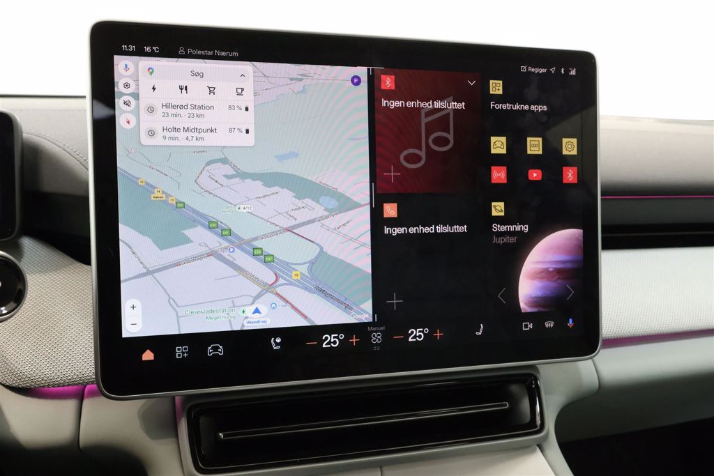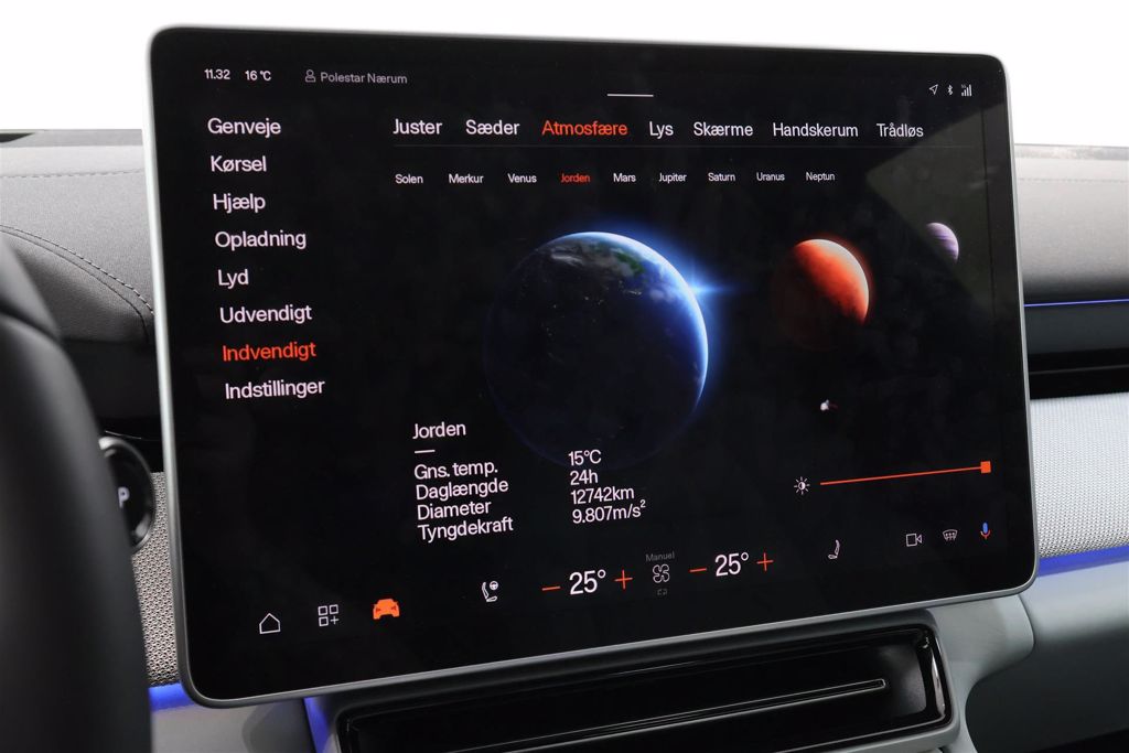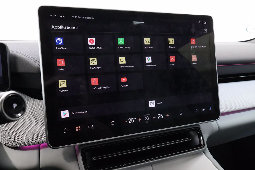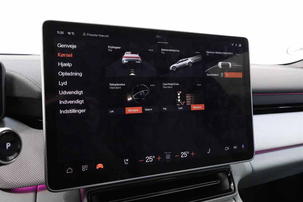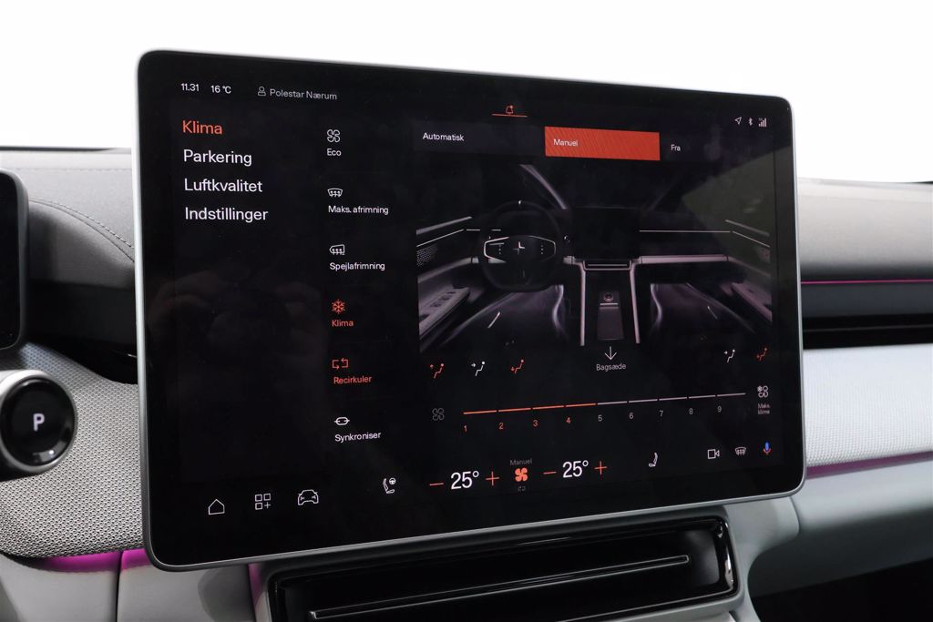 | 15,5" touchscreen, Aircondition, Apple CarPlay Wireless, Aut. nedblændeligt bakspejl, Automatgear, Automatisk op-/nedblænding, Automatisk lys, Bakkamera, Bluetooth, DAB+ radio, Digital instrumentering, Driving assistant, Driving Assistant Plus, El-bagklap med fodsensor, El-foldbare spejle m. memory og varme, El-håndbremse, El-justerbar lændestøtte i forsæder, El-justerbart passagersæde, Elruder for, Elruder for/bag, El-spejle med varme, Fartpilot adaptiv, Frontkamera, Follow Me Home Lys, Harman Kardon anlæg, Head-up display, Håndfri telefon, Indbygget kamera i bakspejl, Indstigningslys, Internet, Klimapakke, Klimaanlæg 4-zoner, Musikstreaming via bluetooth, Navigation, Nøglefri døre, Nøglefri start, One pedal drive, Panoramaglastag, Parkeringssensor for/bag, Planlagt forvarmning af kabine, Polestar connect, Servo, Stemmestyring, Sædevarme for/bag, Udvendig temperaturmåler, Trådløs mobilopladning, Touchskærm, Varme i rat, 20" Alufælge, Adaptive LED Forlygter, Dynamisk Fuld LED forlygter, Kurvelys aktivt, LED baglygter, LED forlygter, LED forlygter med fjernlys assistent, LED Kørelys, LED positionslys, Metallak, Mørktonede ruder bag, Tågelygter for/bag, Ambient belysning, Armlæn m. kopholder i bag, El-justerbart førersæde med memory, El-justerbart rat, Justerbar lændestøtte, Justerbart rat, Kopholder, LED interiørbelysning, Microtech Kabine (Vegansk Læder), Multijusterbart rat, Rat m. varme, Sort himmel, Splitbagsæde, 7 Airbags, Adaptiv Fartpilot, Afstandsradar, AFU (Nødbremseassistance), Airbag, Alarm, Antispin, Automatisk aktivering af nær/fjernlys, Automatisk låsning af døre under kørsel, Automatisk nedblændeligt bakspejl , Automatisk nødbremsesystem, Automatisk nødopkald, Blindvinkelassistent, Dæktrykssensor, ESP, Fører-airbag, Isofix, Kollisionsadvarsel, Lyssensor, Passager-airbag, Selealarm, Side-airbag, Selestrammer, Skiltegenkendelse, Træthedsregistrering, Vejbaneassistent, 1 ejer, 22kW AC-ladning, 360° kamera, A/C, Ambientebelysning, Drejeforlygter, Google maps, Hill Assist, Ikke ryger, Lane Asisst, Nøglefri betjening , Parkeringssensor, Pixel Technology forlygter, service, Sort taghimmel, SOS nødopkald |