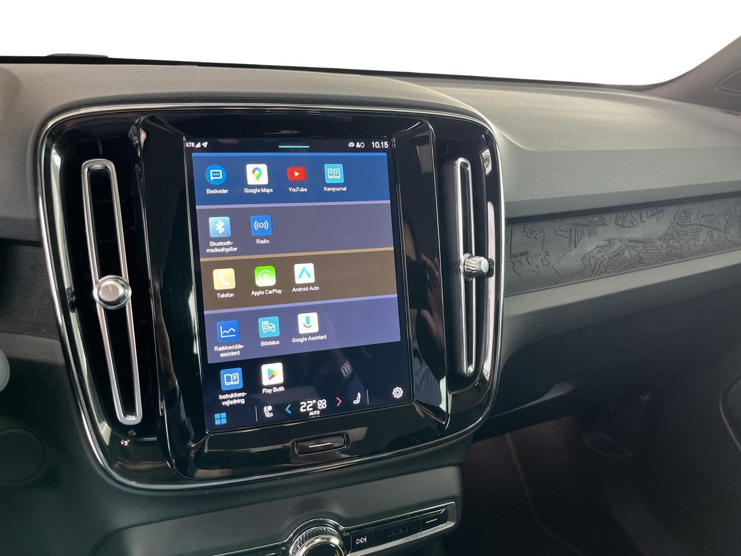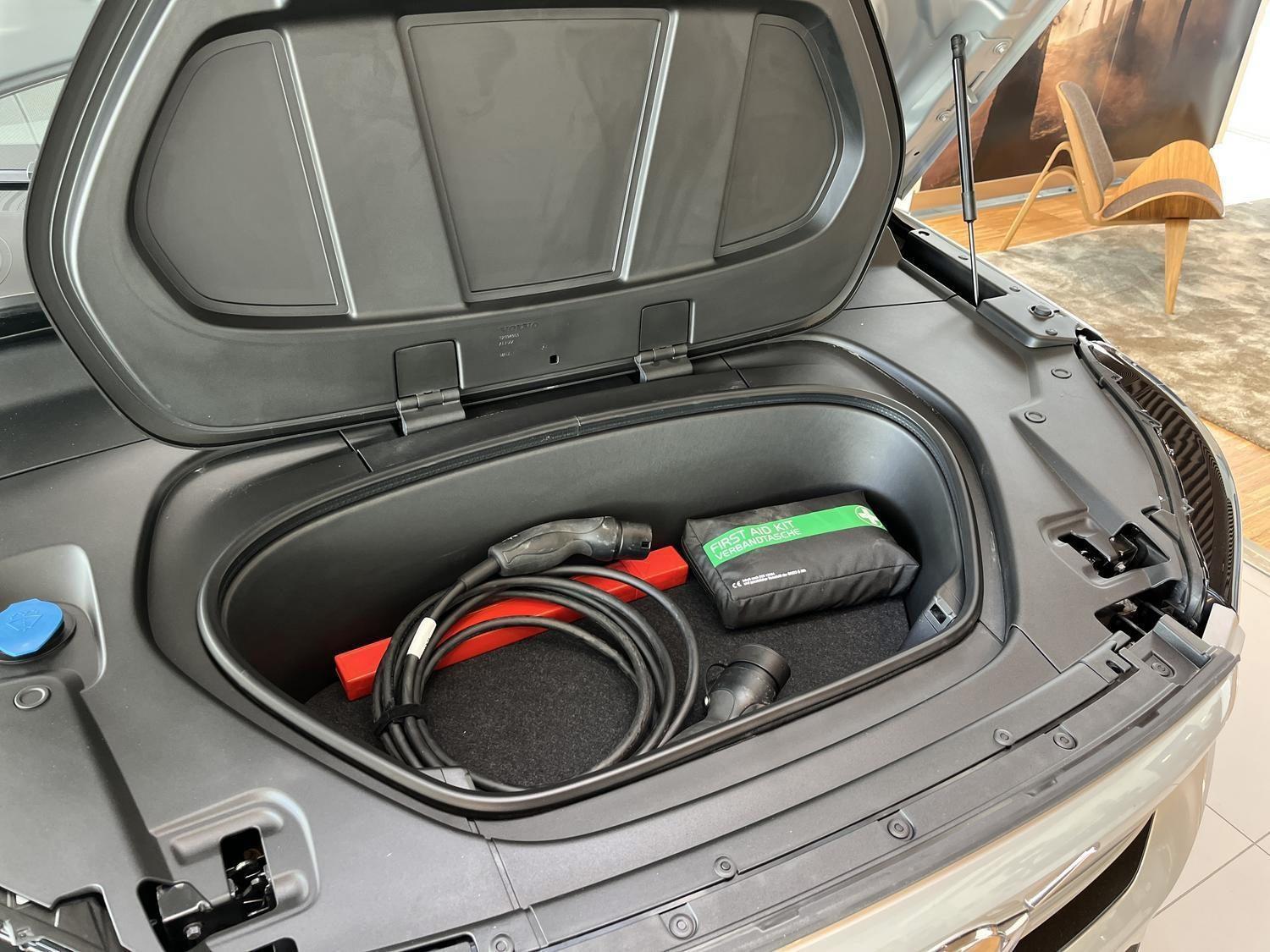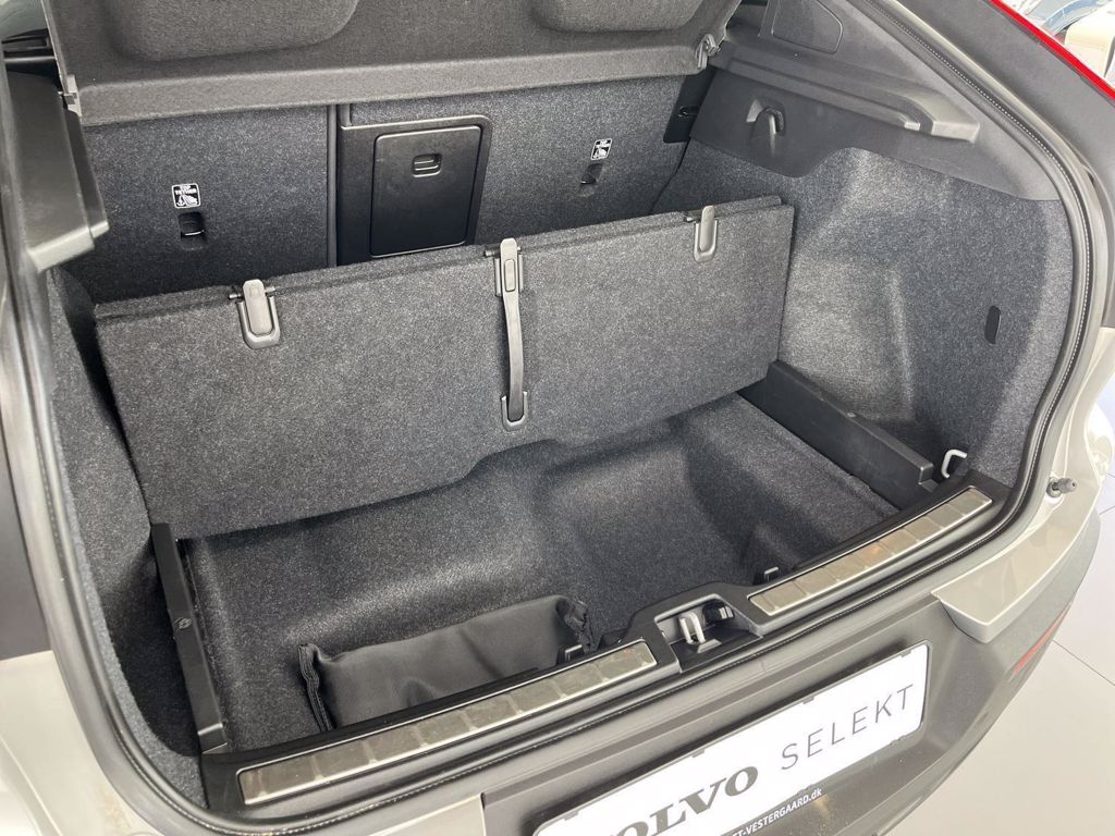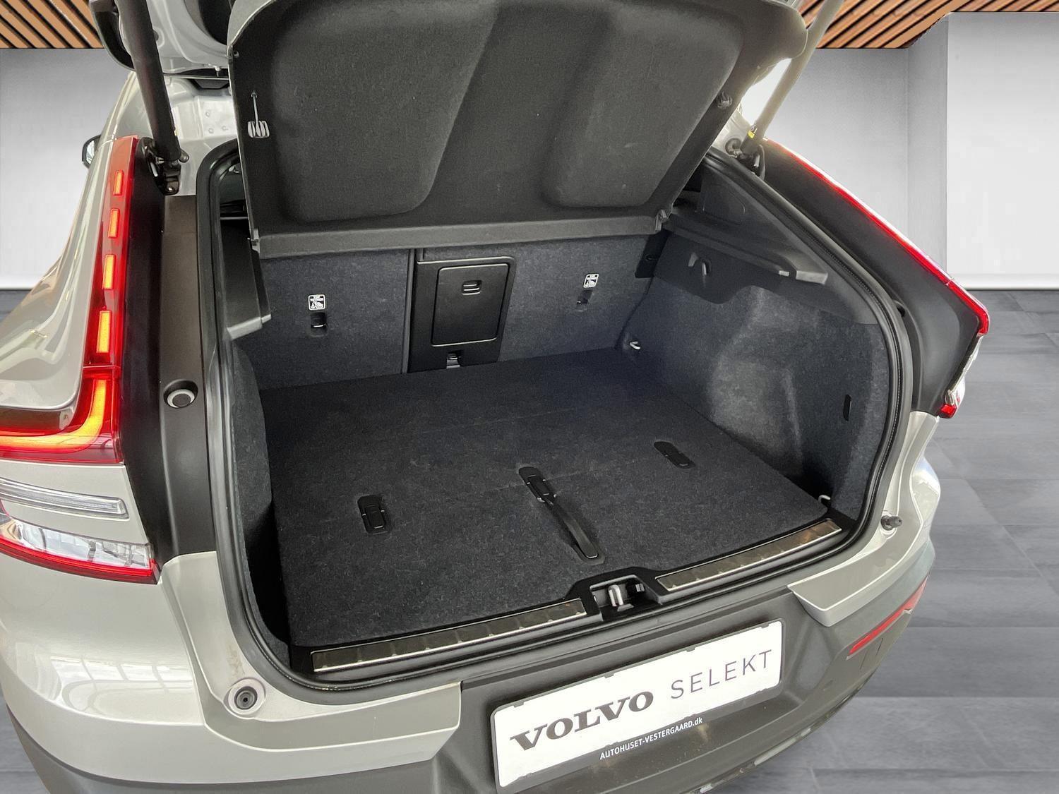 | 12V udtag, Apple CarPlay, Aut. nedblændeligt bakspejl, Automatisk op-/nedblænding, Bakkamera, Bluetooth, DAB+ radio, Digital instrumentering, El indst. førersæde m. memory, Elektrisk bagklap, El-foldbare spejle m. memory og varme, El-håndbremse, El-justerbart passagersæde, Elruder for/bag, Fartpilot adaptiv, Håndfri telefon, Infocenter, Klimaanlæg 2-zoner, Multifunktionsrat, Musikstreaming via bluetooth, Navigation, Nøglefri døre, Nøglefri start, One pedal drive, Parkeringssensor for/bag, Radio, Regnsensor, Trådløs mobilopladning, Udvendig temperaturmåler, USB-C, Varme i bagsæde, Varmepumpe, Volvo On Call, 19" Alufælge, Frunk, Hajfinneantenne, Metallak, Tågelygter for, Armlæn, Armlæn m. kopholder i bag, Bagagerumsdækken, Læderrat, Mørk loftbeklædning, Rat m. varme, Stofindtræk, 7 Airbags, Auto hold, Automatisk nødopkald, Blindvinkelassistent, Isofix, Lyssensor, 3-faset ladning, Helårsdæk, Google maps, Glastag, Ikke ryger, Service overholdt, Volvo Selekt |