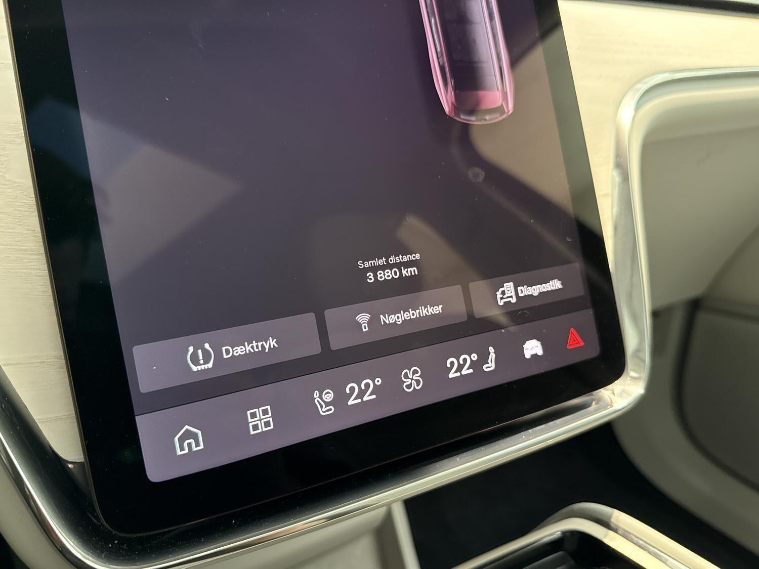 Gardin-airbag, Isofix, Regnsensor, Bluetooth, Håndfri telefon, Frunk, Kollisionsadvarsel, Volvo On Call, Vejbaneassistent, Skiltegenkendelse, Automatisk nødbremsesystem, USB-C, Active Steering Assist , Elektrisk bagklap, 360 gr. View kamera, Forberedt til anhængertræk, Apple CarPlay Wireless, Apple CarPlay, Android Auto Wireless, Android Auto, Aircondition, Klimaanlæg 4-zoner, Airbag, Varmepumpe, Panoramaglastag, DAB+ radio, BOSE-soundpakke, Trådløs mobilopladning, Google maps, Head-up display, Alarm, Centrallås, BLIS, El indst. førersæde m. memory, El-justerbart passagersæde, Sædevarme for/bag, 7 sæder, El-justerbar lændestøtte, Automatisk nedblændeligt bakspejl , 20" Alufælge, Varme i rat, El-justerbart rat, Park Assistent , Navigation, Læderrat, Nøglefri start, Nøglefri døre, Elektrisk parkeringsbremse, Dobbelt bagagerumsbund , Splitbagsæde, El-foldbare spejle m. varme, Matrix LED forlygter, LED baglygter, Dynamisk Fuld LED forlygter, Fjernbetjent centrallås, Adaptiv Fartpilot, Kørecomputer, Digital instrumentering, Stofindtræk, Bagagerumsdækken, Udvendig temperaturmåler, Elruder for/bag, Førerovervågning med advarsel, Træthedsregistrering, Blindvinkelassistent, Auto Hold, Antispin, ESP