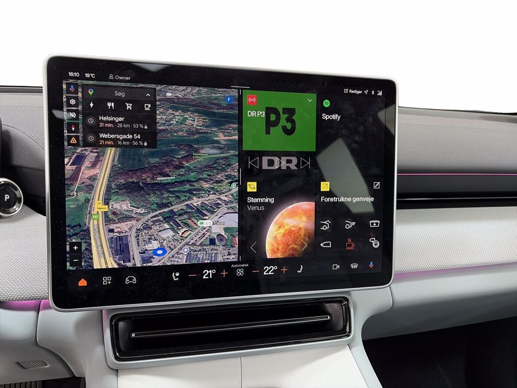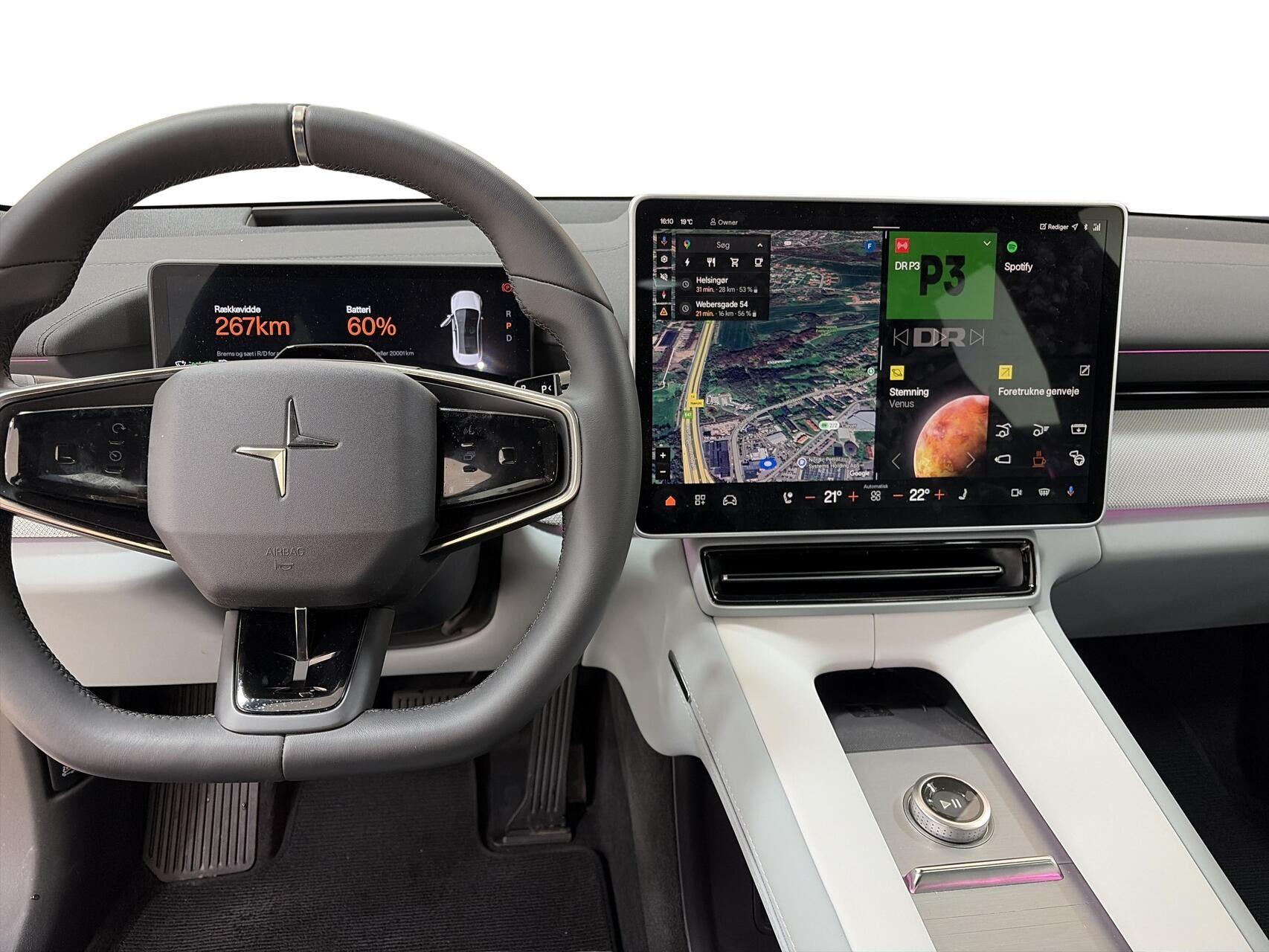 | 22 KWh lader, 10,2 fuld digital førerskærm , 15,4" touchscreen, 230V udtag, Android Auto, Apple CarPlay Wireless, Digital instrumentering, Driving assistant, Centrallås, Bakkamera, El indst. førersæde m. memory, El-bagklap med fodsensor, El-foldbare spejle, El-justerbar lændestøtte i forsæder, Elruder for/bag, El-spejle med varme, Fartpilot adaptiv, Fjernbetjent centrallås, Fod betjent bagklap, Follow Me Home Lys, Frontkamera, Harman Kardon anlæg, Hastighedsbegrænser, Head-up display, Indbygget kamera i bakspejl, Indstigningslys, Infocenter, Internet, Klimapakke, Klimaanlæg 3-zoner, Kørecomputer, Multifunktionsrat, Navigation, Nøglefri døre, Nøglefri start, One pedal drive, panoramaglastag, Parkeringssensor for/bag, Planlagt forvarmning af kabine, Polestar connect, Stemmebetjening, Sædevarme for/bag, Trådløs mobilopladning, Udvendig temperaturmåler, USB-C, Varme i rat, Varmepumpe, 20" Alufælge, Adaptive LED Forlygter, Frunk, Indfarvede kofangere, Kurvelys, LED baglygter, LED forlygter, LED kørelys, Metallak, Ambiente belysning, Armlæn m. kopholder i bag, Armlæn bag, El-justerbart rat, El-justerbart førersæde med memory, Fartbegrænser, Fleksibel bagagerumsbund, Glastag, Multijusterbart rat, Splitbagsæde, Adaptiv Fartpilot, Automatisk aktivering af nær/fjernlys, BLIS, Blindvinkelassistent, Dæktrykssensor, ESP, Gardin-airbag, Intelli. hastighedsassistent, IntelliSafe Assist, Førerovervågning med advarsel, Fører-airbag, Isofix, Kollisionsadvarsel, Lyssensor, Passager-airbag, Real time traffic, Selealarm, Selestrammer, Side-airbag, Træthedsregistrering, Vejbaneassistent |