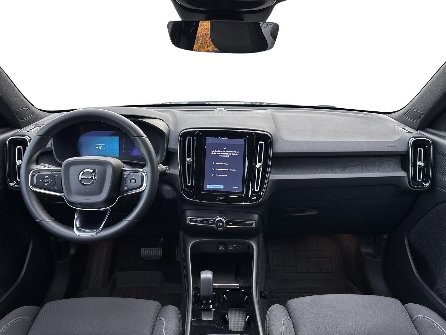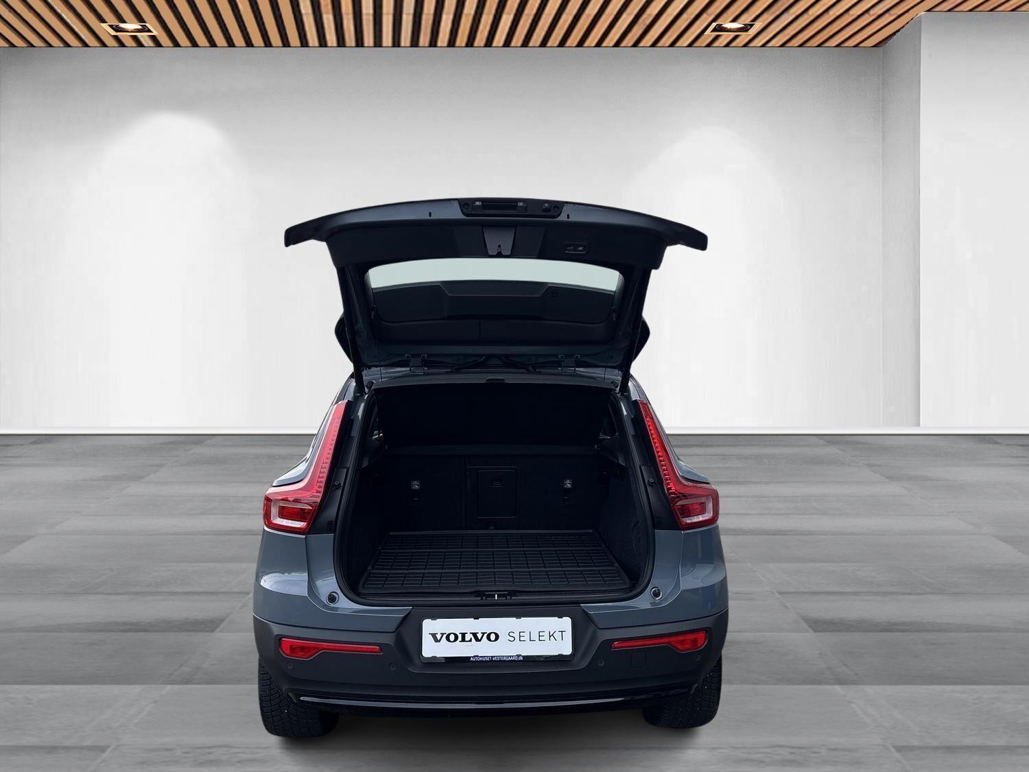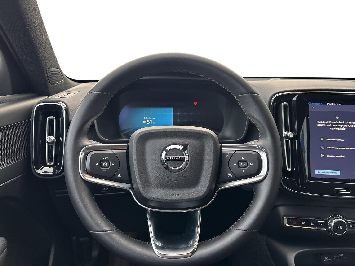 | Apple CarPlay, Automatgear, Automatisk lys, Bakkamera, Bluetooth, Centrallås, DAB radio, Digital instrumentering, El betjente døre, Elektrisk bagklap, El-foldbare spejle, El-håndbremse, El-justerbar lændestøtte, Elruder for/bag, El-spejle, Fartbegrænser, Fartpilot, Fjernbetjent centrallås, Hastighedsbegrænser, Håndfri telefon, Infocenter, Internet, Klimapakke, Klimaanlæg 2-zoner, Kørecomputer, Multifunktionsrat, Musikstreaming via bluetooth, Navigation, Nøglefri døre, Nøglefri start, One pedal drive, Parkeringssensor for/bag, Radio inkl DAB med USB-indgang & Bluetooth, Regnsensor, Servo, Stemmebetjening, Stemmestyring, Sædevarme for/bag, Touchskærm, Trådløs mobilopladning, Udvendig temperaturmåler, USB-C, Varme i rat, Varmepumpe, Volvo On Call, 19" Alufælge, Frunk, LED kørelys, Sort tag , Tagræling, Tågelygter, Armlæn, Fleksibel bagagerumsbund, Justerbart rat, Kopholder, Læderrat (Kunstlæder), Splitbagsæde, ABS, Alarm, Airbag, Auto hold, Dæktrykssensor, Selealarm, Skiltegenkendelse, Google maps, Gummimåtter, Helårsdæk, Hill Assist, Lane Asisst, Vinterhjul kan tilkøbes |