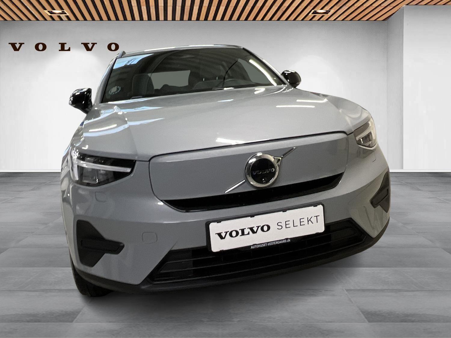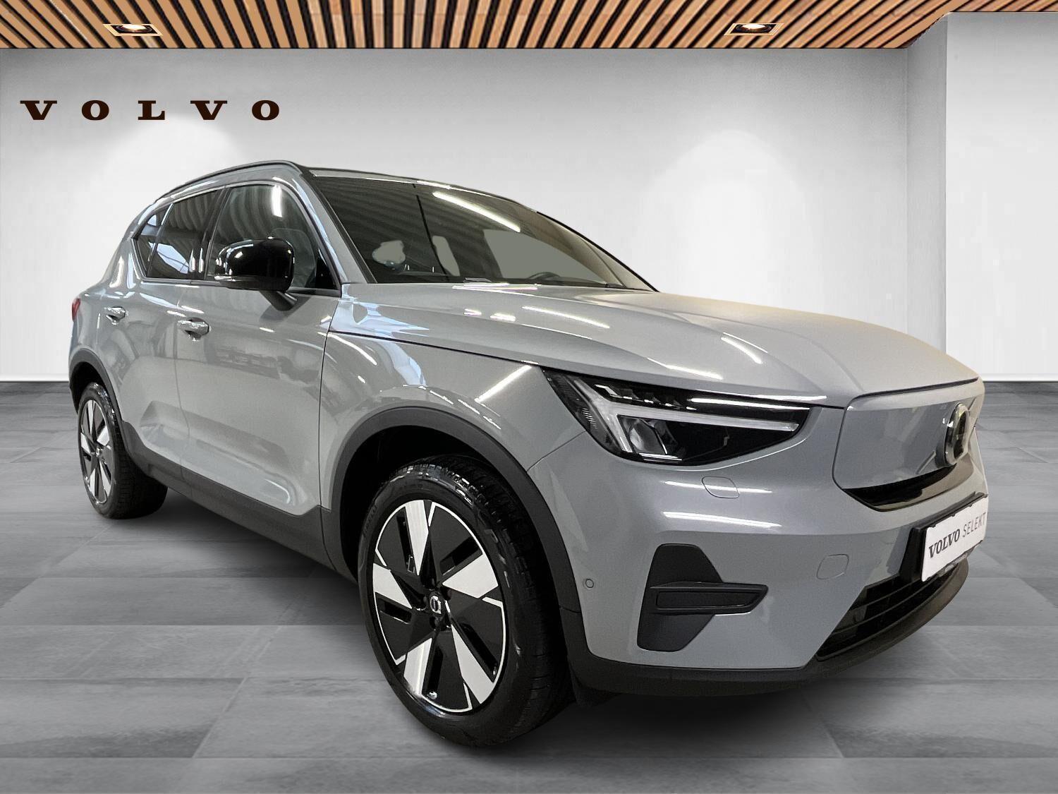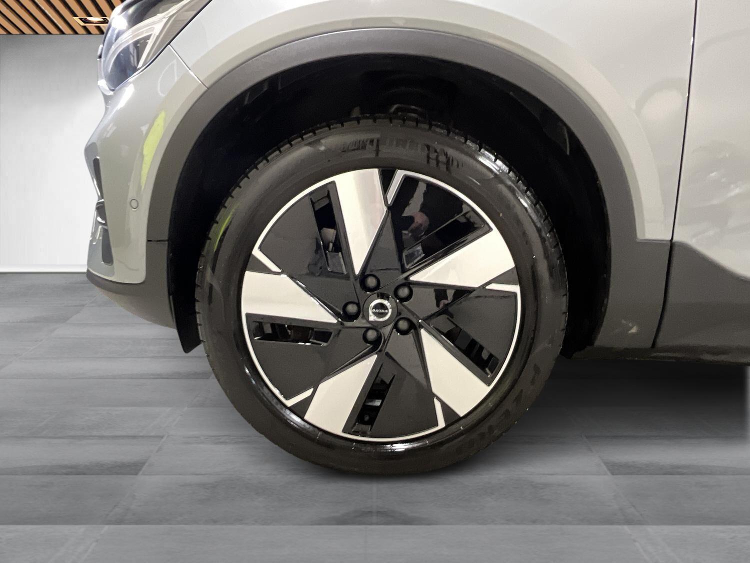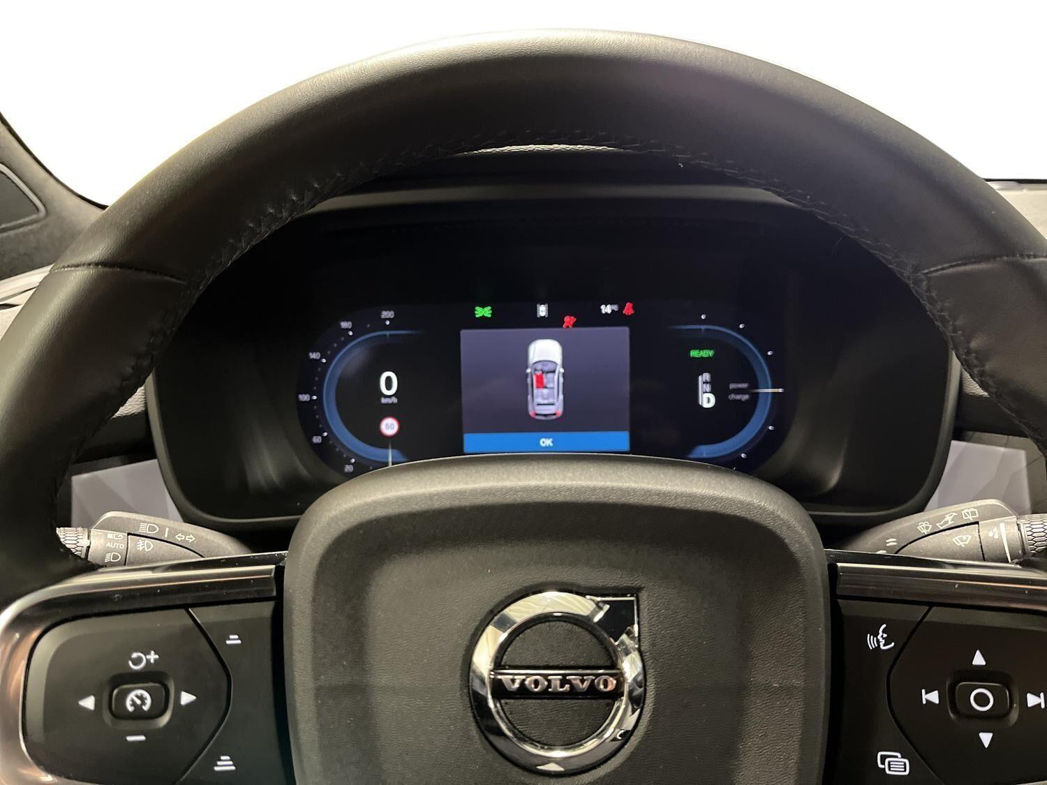 | Apple CarPlay, Automatgear, Aut. nedblændeligt bakspejl, Automatisk op-/nedblænding, Bakkamera, Bluetooth, Centrallås, Digital instrumentering, El-bagklap med fodsensor, El-foldbare spejle, El-håndbremse, El-justerbar lændestøtte i forsæder, El-justerbart passagersæde, Elruder for/bag, Fartpilot adaptiv, Håndfri telefon, Indstigningslys, Internet, Klimaanlæg 2-zoner, Musikstreaming via bluetooth, Navigation, Nøglefri døre, Nøglefri start, One pedal drive, Parkerings assistent, Planlagt forvarmning af kabine, Regnsensor, Stemmebetjening, Sædevarme for, Trådløs mobilopladning, Udvendig temperaturmåler, USB-C, Varme i rat, Varmepumpe, Varme i bagruden, 19" Alufælge, Adaptive forlygter, Alufælge, DC Hurtiglader, Frunk, LED baglygter, LED forlygter, LED kørelys, LED positionslys, Tonede ruder, Armlæn, Armlæn bag, Fartbegrænser, Justerbart rat, Kopholder, Trådløs opladning af smartphone, 360 graders kamera, Adaptiv Fartpilot, Alarm, Airbag, Antispin, Auto hold, Automatisk aktivering af nær/fjernlys, Automatisk låsning af døre under kørsel, Automatisk nødopkald, Automatisk nødbremsesystem, BLIS, Dæktrykssensor, Fører-airbag, Gardin-airbag, Intelli. hastighedsassistent, Isofix, Kollisionsadvarsel, Lyssensor, Passager-airbag, Real time traffic, Selealarm, Selestrammer, Side-airbag, Skiltegenkendelse, Vejbaneassistent, Volvo On Cal |
