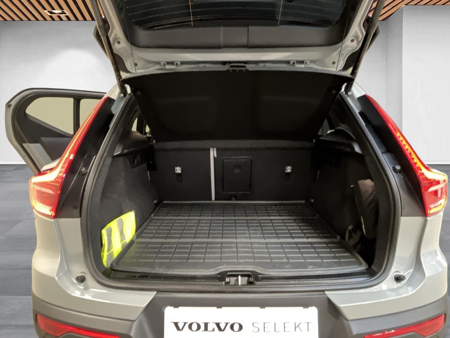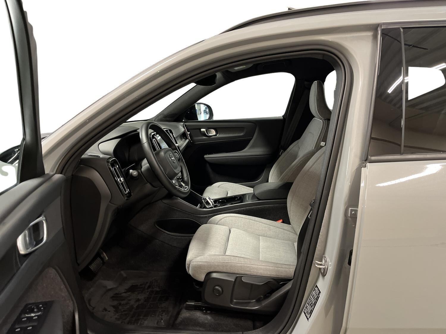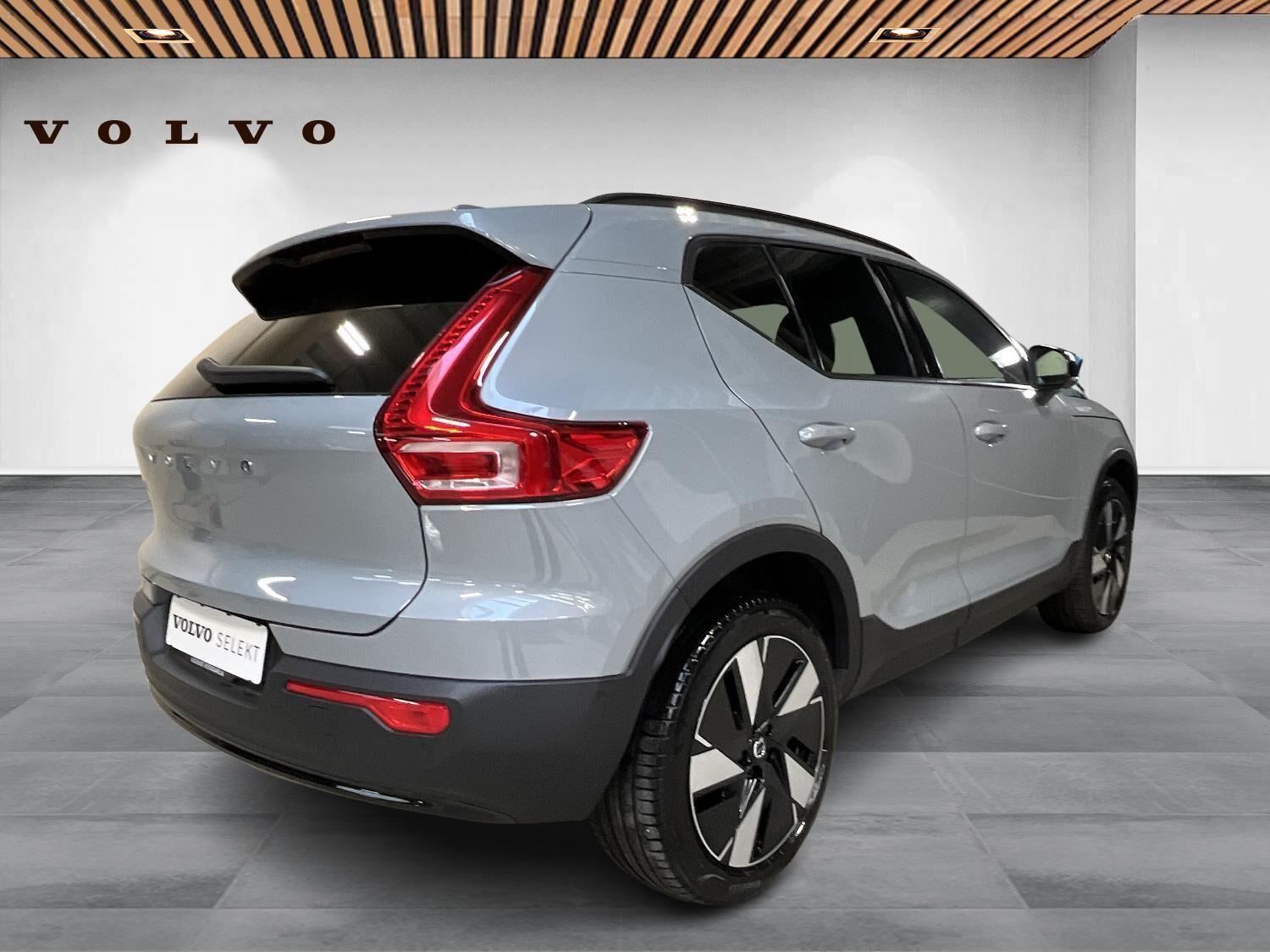 | Apple CarPlay, Automatgear, Aut. nedblændeligt bakspejl, Automatisk op-/nedblænding, Bakkamera, Bluetooth, Centrallås, Digital instrumentering, El-bagklap med fodsensor, El-foldbare spejle, El-håndbremse, El-justerbar lændestøtte i forsæder, El-justerbart passagersæde, Elruder for/bag, Fartpilot adaptiv, Håndfri telefon, Indstigningslys, Internet, Klimaanlæg 2-zoner, Musikstreaming via bluetooth, Navigation, Nøglefri døre, Nøglefri start, One pedal drive, Parkerings assistent, Planlagt forvarmning af kabine, Regnsensor, Stemmebetjening, Sædevarme for, Trådløs mobilopladning, Udvendig temperaturmåler, USB-C, Varme i rat, Varmepumpe, Varme i bagruden, 19" Alufælge, Adaptive forlygter, Alufælge, DC Hurtiglader, Frunk, LED baglygter, LED forlygter, LED kørelys, LED positionslys, Tonede ruder, Armlæn, Armlæn bag, Fartbegrænser, Justerbart rat, Kopholder, Trådløs opladning af smartphone, 360 graders kamera, Adaptiv Fartpilot, Alarm, Airbag, Antispin, Auto hold, Automatisk aktivering af nær/fjernlys, Automatisk låsning af døre under kørsel, Automatisk nødopkald, Automatisk nødbremsesystem, BLIS, Dæktrykssensor, Fører-airbag, Gardin-airbag, Intelli. hastighedsassistent, Isofix, Kollisionsadvarsel, Lyssensor, Passager-airbag, Real time traffic, Selealarm, Selestrammer, Side-airbag, Skiltegenkendelse, Vejbaneassistent, Volvo On Cal |