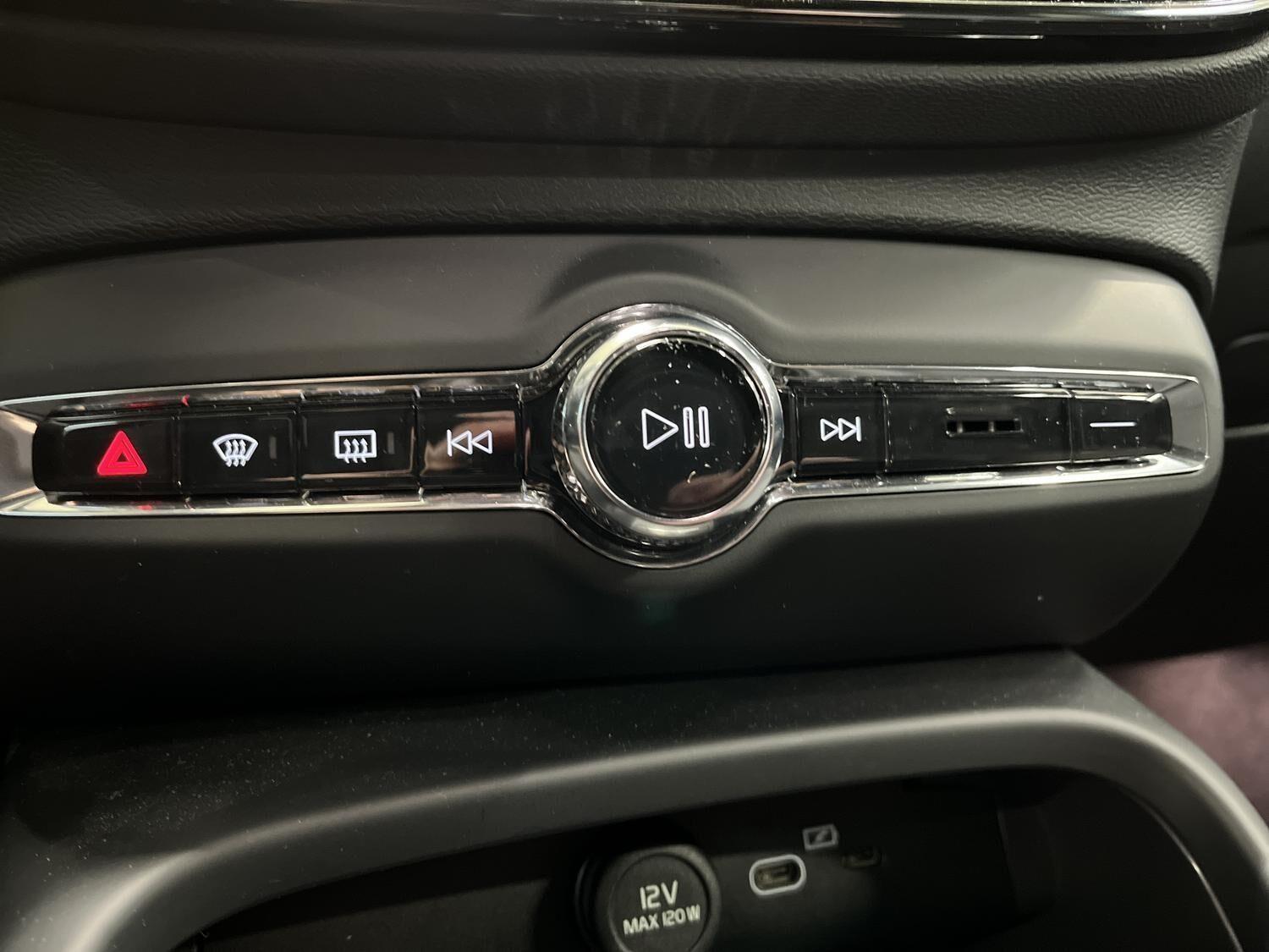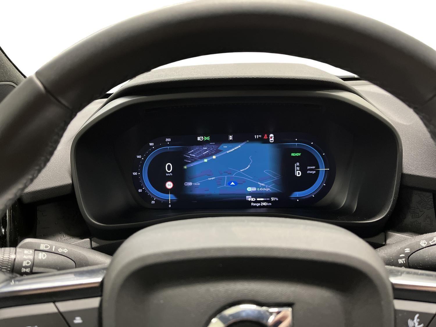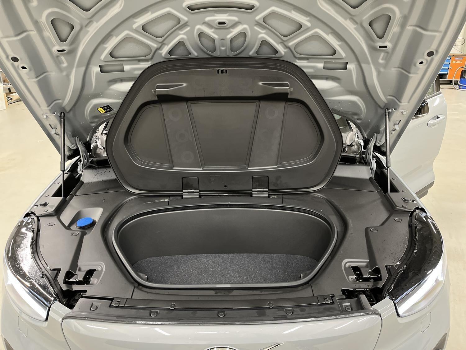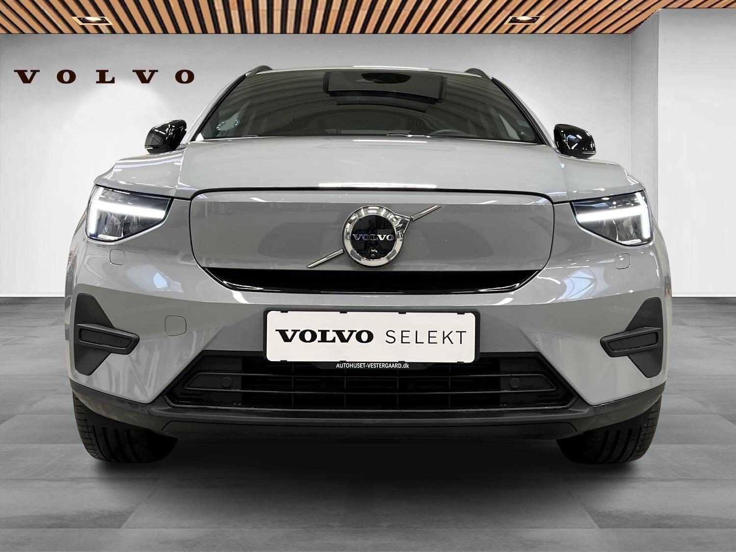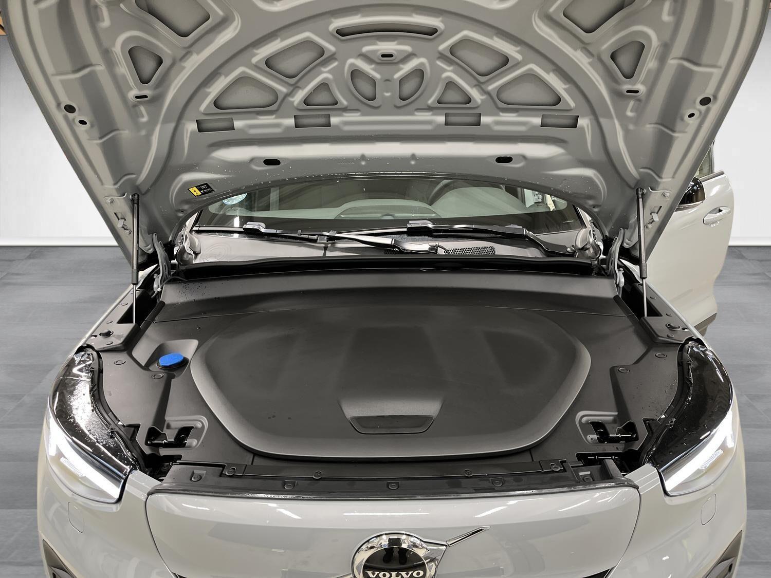 | Apple CarPlay, Automatgear, Aut. nedblændeligt bakspejl, Automatisk op-/nedblænding, Bakkamera, Bluetooth, Centrallås, Digital instrumentering, El-bagklap med fodsensor, El-foldbare spejle, El-håndbremse, El-justerbar lændestøtte i forsæder, El-justerbart passagersæde, Elruder for/bag, Fartpilot adaptiv, Håndfri telefon, Indstigningslys, Internet, Klimaanlæg 2-zoner, Musikstreaming via bluetooth, Navigation, Nøglefri døre, Nøglefri start, One pedal drive, Parkerings assistent, Planlagt forvarmning af kabine, Regnsensor, Stemmebetjening, Sædevarme for, Trådløs mobilopladning, Udvendig temperaturmåler, USB-C, Varme i rat, Varmepumpe, Varme i bagruden, 19" Alufælge, Adaptive forlygter, Alufælge, DC Hurtiglader, Frunk, LED baglygter, LED forlygter, LED kørelys, LED positionslys, Tonede ruder, Armlæn, Armlæn bag, Fartbegrænser, Justerbart rat, Kopholder, Trådløs opladning af smartphone, 360 graders kamera, Adaptiv Fartpilot, Alarm, Airbag, Antispin, Auto hold, Automatisk aktivering af nær/fjernlys, Automatisk låsning af døre under kørsel, Automatisk nødopkald, Automatisk nødbremsesystem, BLIS, Dæktrykssensor, Fører-airbag, Gardin-airbag, Intelli. hastighedsassistent, Isofix, Kollisionsadvarsel, Lyssensor, Passager-airbag, Real time traffic, Selealarm, Selestrammer, Side-airbag, Skiltegenkendelse, Vejbaneassistent, Volvo On Cal |