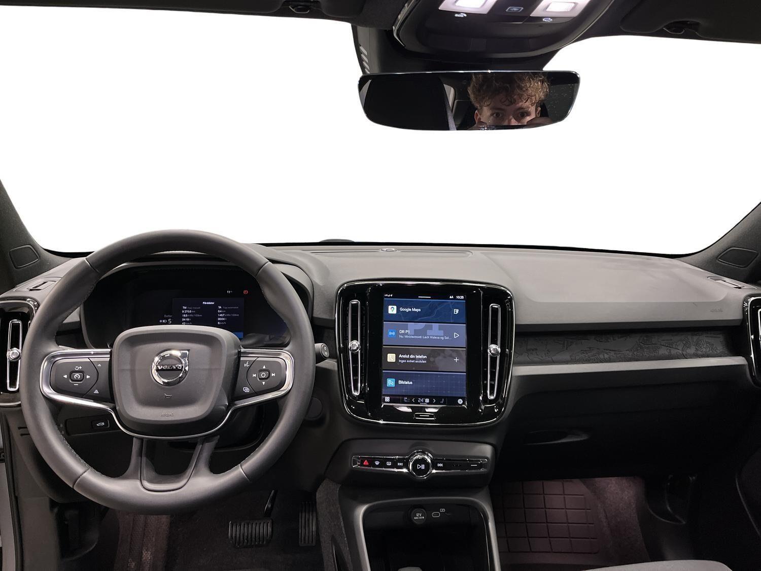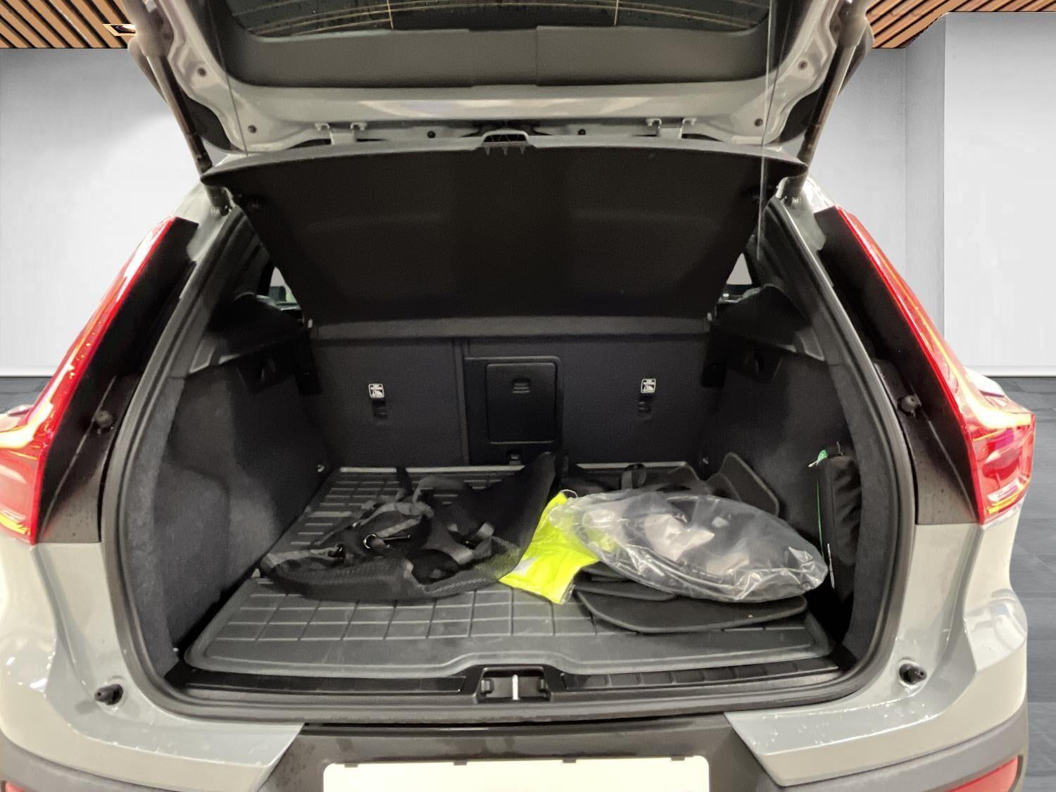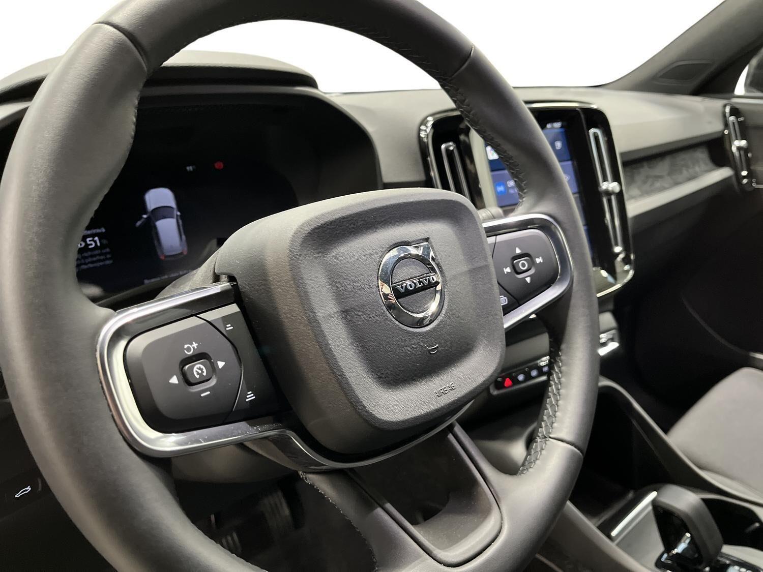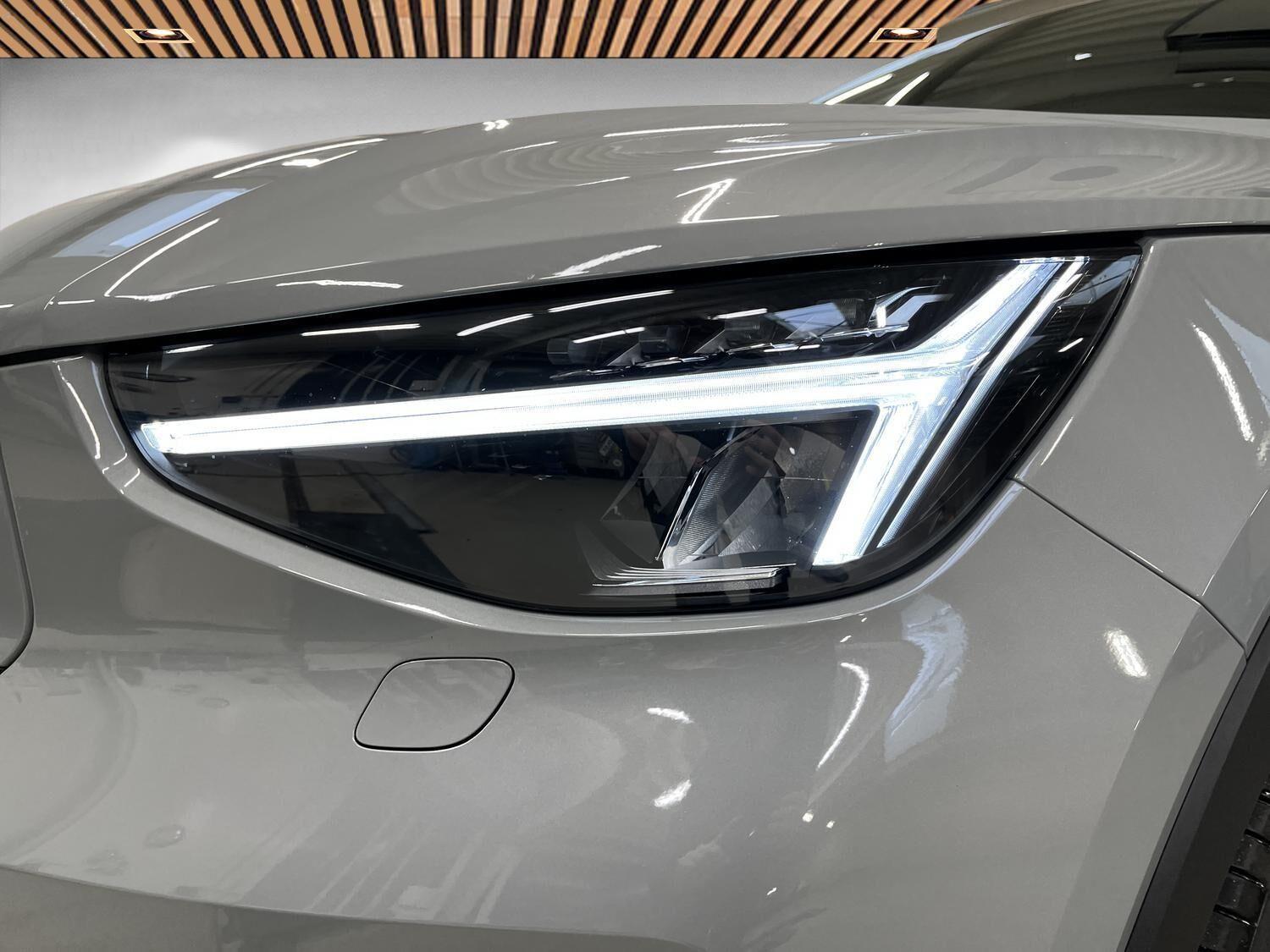 | Apple CarPlay, Automatgear, Aut. nedblændeligt bakspejl, Automatisk op-/nedblænding, Bakkamera, Bluetooth, Centrallås, Digital instrumentering, El-bagklap med fodsensor, El-foldbare spejle, El-håndbremse, El-justerbar lændestøtte i forsæder, El-justerbart passagersæde, Elruder for/bag, Fartpilot adaptiv, Håndfri telefon, Indstigningslys, Internet, Klimaanlæg 2-zoner, Musikstreaming via bluetooth, Navigation, Nøglefri døre, Nøglefri start, One pedal drive, Parkerings assistent, Planlagt forvarmning af kabine, Regnsensor, Stemmebetjening, Sædevarme for, Trådløs mobilopladning, Udvendig temperaturmåler, USB-C, Varme i rat, Varmepumpe, Varme i bagruden, 19" Alufælge, Adaptive forlygter, Alufælge, DC Hurtiglader, Frunk, LED baglygter, LED forlygter, LED kørelys, LED positionslys, Tonede ruder, Armlæn, Armlæn bag, Fartbegrænser, Justerbart rat, Kopholder, Trådløs opladning af smartphone, 360 graders kamera, Adaptiv Fartpilot, Alarm, Airbag, Antispin, Auto hold, Automatisk aktivering af nær/fjernlys, Automatisk låsning af døre under kørsel, Automatisk nødopkald, Automatisk nødbremsesystem, BLIS, Dæktrykssensor, Fører-airbag, Gardin-airbag, Intelli. hastighedsassistent, Isofix, Kollisionsadvarsel, Lyssensor, Passager-airbag, Real time traffic, Selealarm, Selestrammer, Side-airbag, Skiltegenkendelse, Vejbaneassistent, Volvo On Cal |