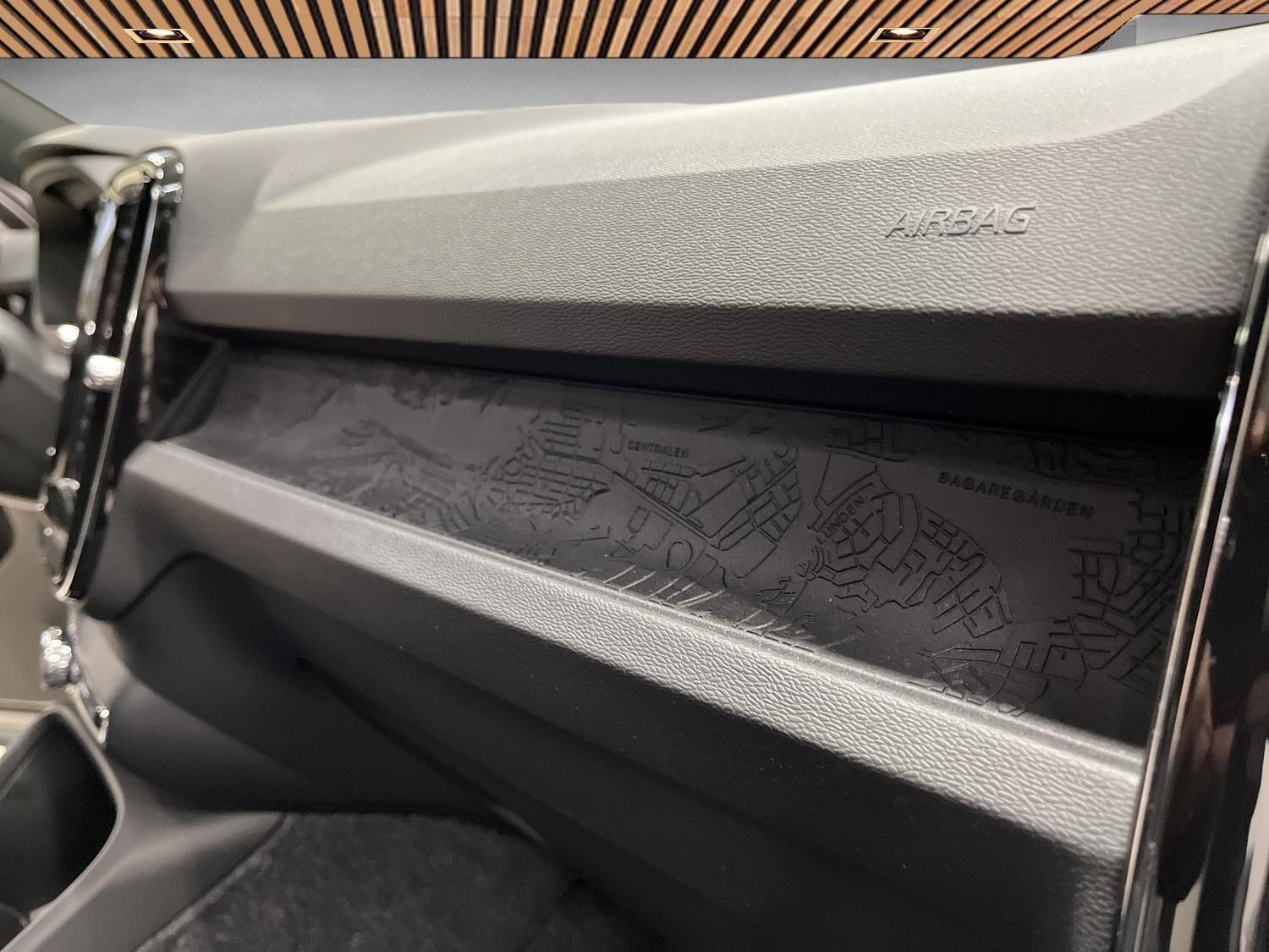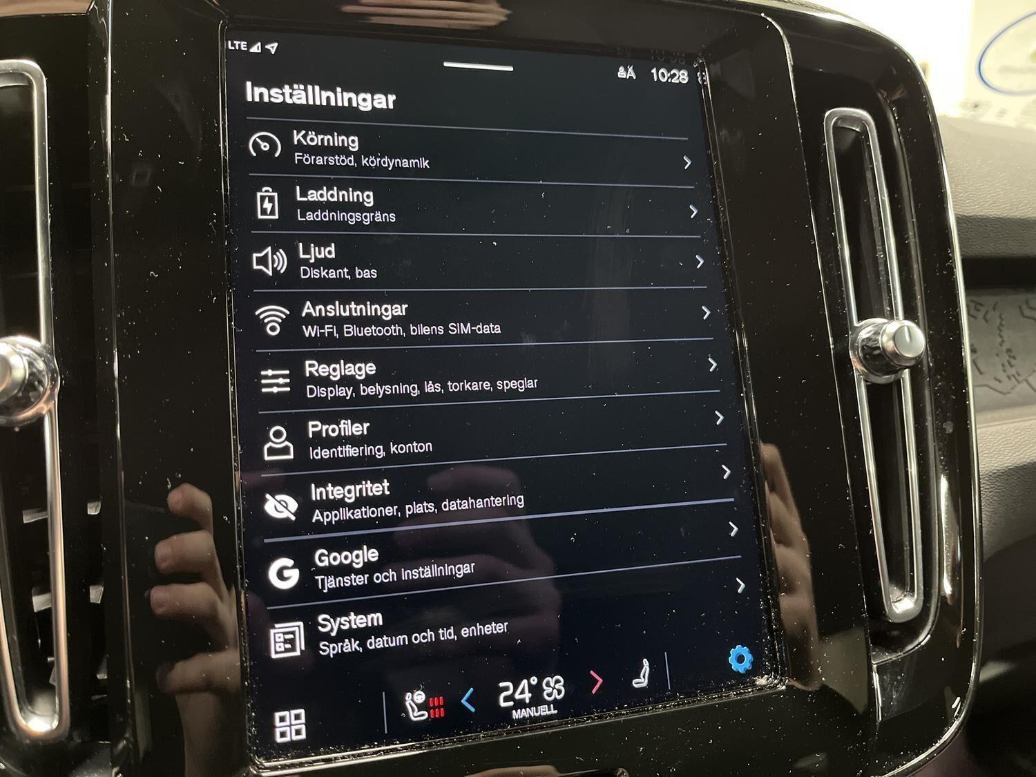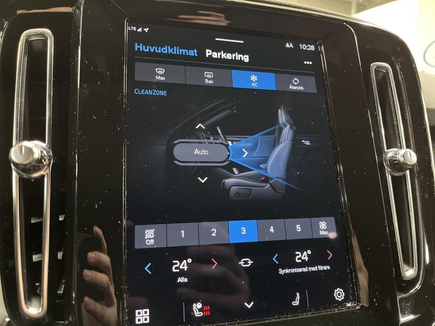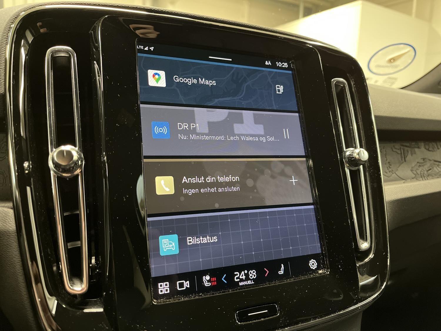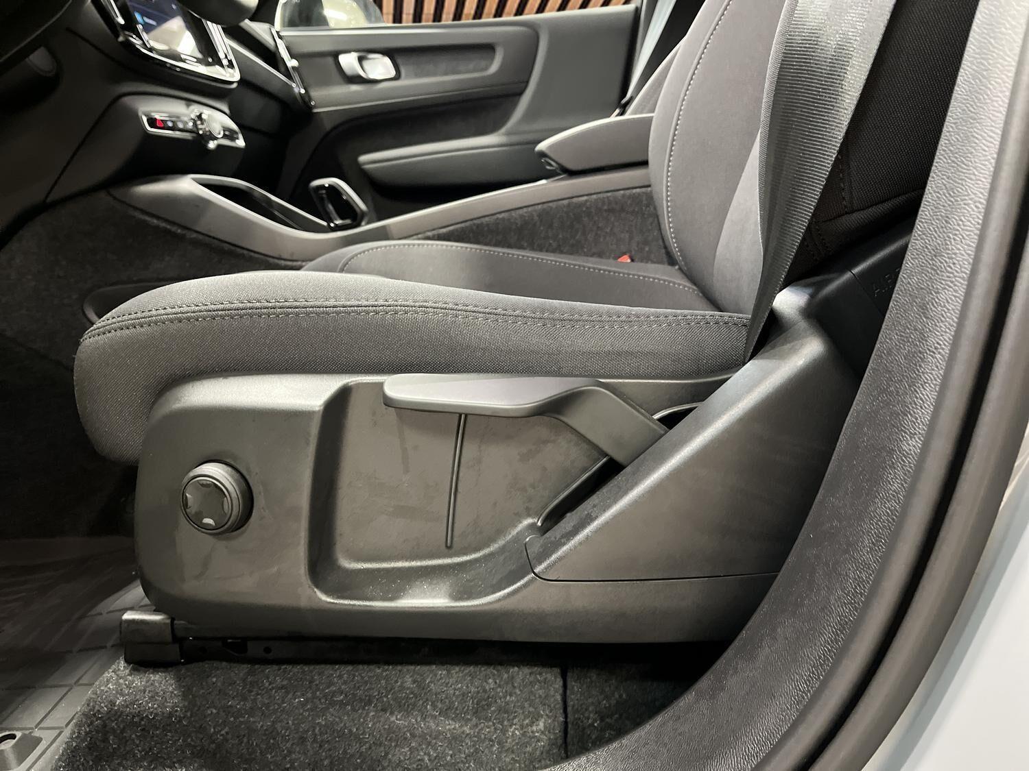 | Apple CarPlay, Automatgear, Aut. nedblændeligt bakspejl, Automatisk op-/nedblænding, Bakkamera, Bluetooth, Centrallås, Digital instrumentering, El-bagklap med fodsensor, El-foldbare spejle, El-håndbremse, El-justerbar lændestøtte i forsæder, El-justerbart passagersæde, Elruder for/bag, Fartpilot adaptiv, Håndfri telefon, Indstigningslys, Internet, Klimaanlæg 2-zoner, Musikstreaming via bluetooth, Navigation, Nøglefri døre, Nøglefri start, One pedal drive, Parkerings assistent, Planlagt forvarmning af kabine, Regnsensor, Stemmebetjening, Sædevarme for, Trådløs mobilopladning, Udvendig temperaturmåler, USB-C, Varme i rat, Varmepumpe, Varme i bagruden, 19" Alufælge, Adaptive forlygter, Alufælge, DC Hurtiglader, Frunk, LED baglygter, LED forlygter, LED kørelys, LED positionslys, Tonede ruder, Armlæn, Armlæn bag, Fartbegrænser, Justerbart rat, Kopholder, Trådløs opladning af smartphone, 360 graders kamera, Adaptiv Fartpilot, Alarm, Airbag, Antispin, Auto hold, Automatisk aktivering af nær/fjernlys, Automatisk låsning af døre under kørsel, Automatisk nødopkald, Automatisk nødbremsesystem, BLIS, Dæktrykssensor, Fører-airbag, Gardin-airbag, Intelli. hastighedsassistent, Isofix, Kollisionsadvarsel, Lyssensor, Passager-airbag, Real time traffic, Selealarm, Selestrammer, Side-airbag, Skiltegenkendelse, Vejbaneassistent, Volvo On Cal |