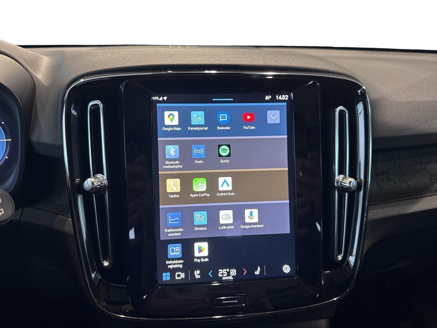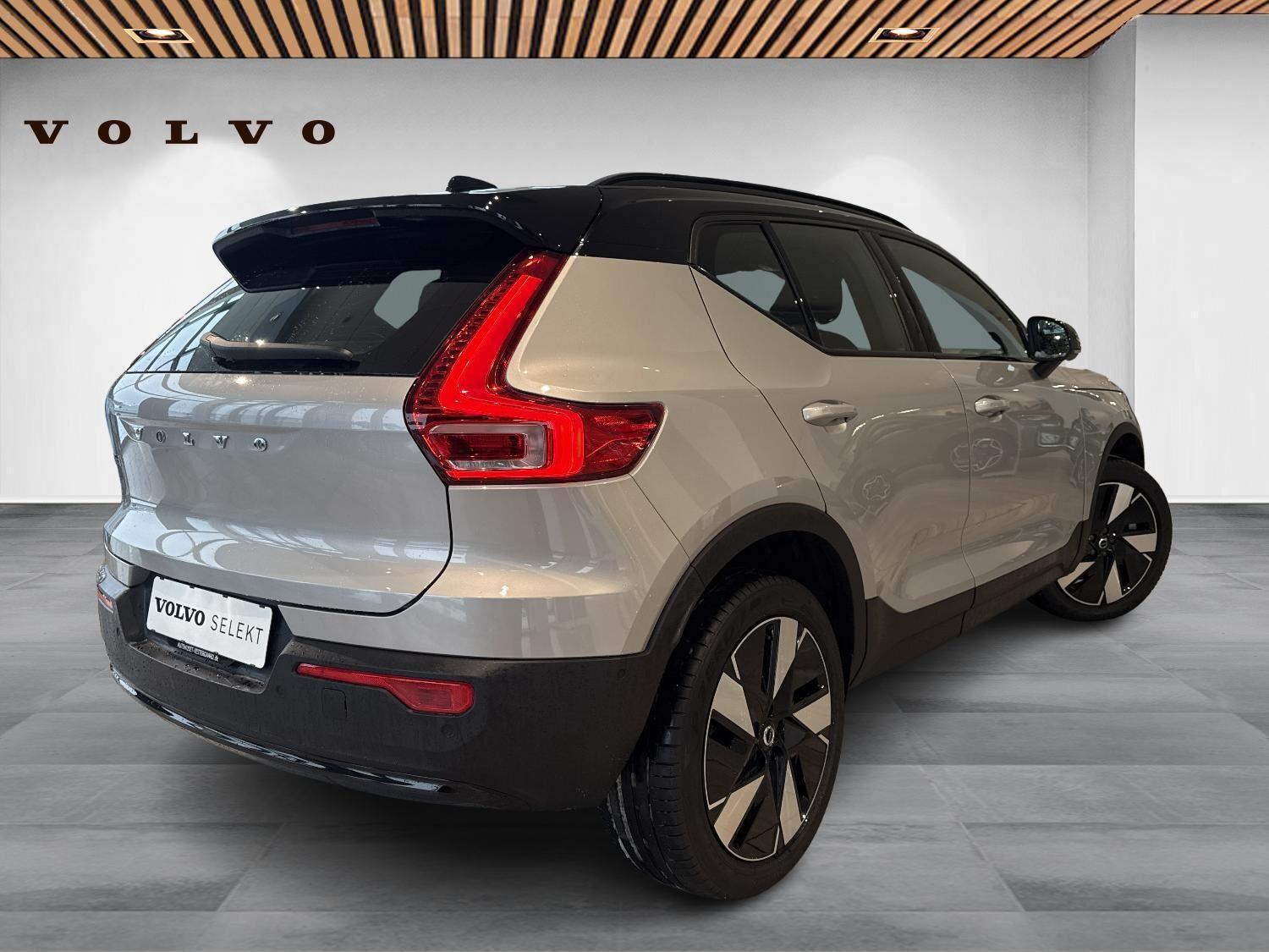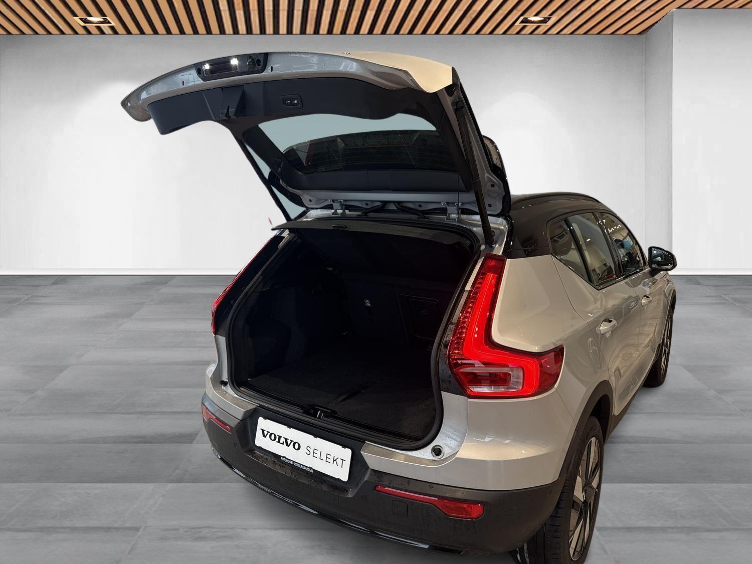 | Apple CarPlay, Aut. nedblændeligt bakspejl, Automatisk lys, Automatisk op-/nedblænding, Bakkamera, Bluetooth, Centrallås, DAB radio, Digital instrumentering, El indst. forsæder, El indst. førersæde m. memory, El-bagklap med fodsensor, El-forbold spejle m. memory, aut. nedblædning og varme, El-håndbremse, El-justerbar lændestøtte i forsæder, Elruder for/bag, El-spejle, Fartbegrænser, Fartpilot adaptiv, Fjernbetjent centrallås, Frontkamera, Harman Kardon anlæg, Hastighedsbegrænser, Håndfri telefon, Infocenter, Internet, Klimapakke, Klimaanlæg 2-zoner, Kørecomputer, Multifunktionsrat, Musikstreaming via bluetooth, Navigation, Nøglefri døre, Nøglefri start, One pedal drive, Panoramasoltag, Parkeringssensor for/bag, Planlagt forvarmning af kabine, Regnsensor, Servo, Stemmestyring, Sædevarme for/bag, Touchskærm, Trådløs mobilopladning, Udvendig temperaturmåler, USB-C, Varme i bagruden, Varme i bagsæde, Varme i rat, Varmepumpe, Varmepumpe , 19" Alufælge, DC Hurtiglader, Frunk, Fuld LED forlygter, LED forlygter, LED kørelys, Metallak, Armlæn, Armlæn bag, Bagagerumsdækken, LED interiørbelysning, Læderrat (Kunstlæder), Multijusterbart rat, Mørk loftbeklædning, Rat m. varme, Sort himmel, Splitbagsæde, Stofindtræk, Trådløs opladning af smartphone, 360 gr. View kamera, 360 graders kamera, 3-Faset, ABS, Adaptiv Fartpilot, Afstandsradar, Airbag, Alarm, Antispin, Blindvinkelassistent, BLIS, Fører-airbag, Isofix, Lyssensor, Pilot Assist, Selealarm, Skiltegenkendelse, Træthedsregistrering, Vejbaneassistent, Volvo On Call |