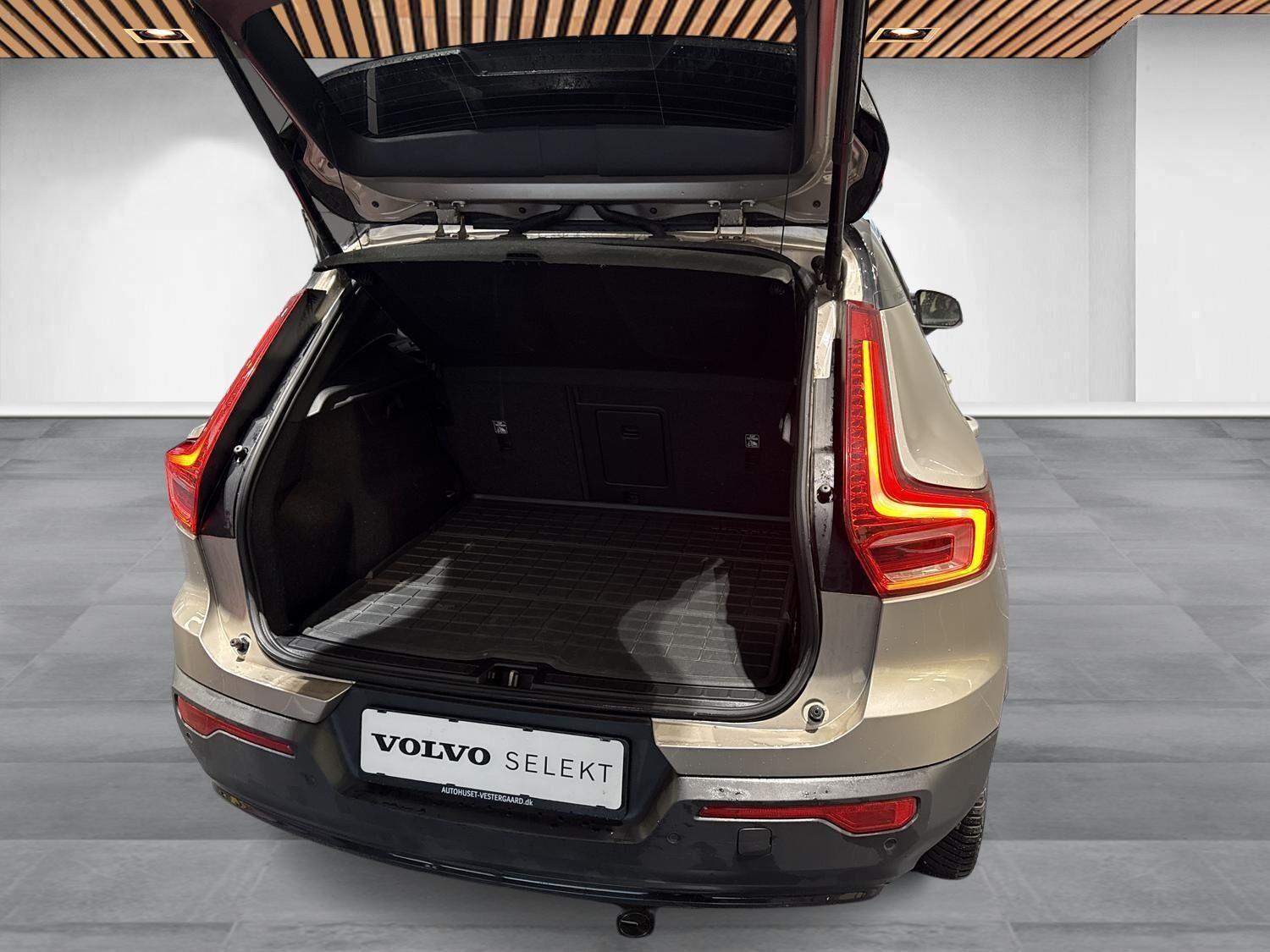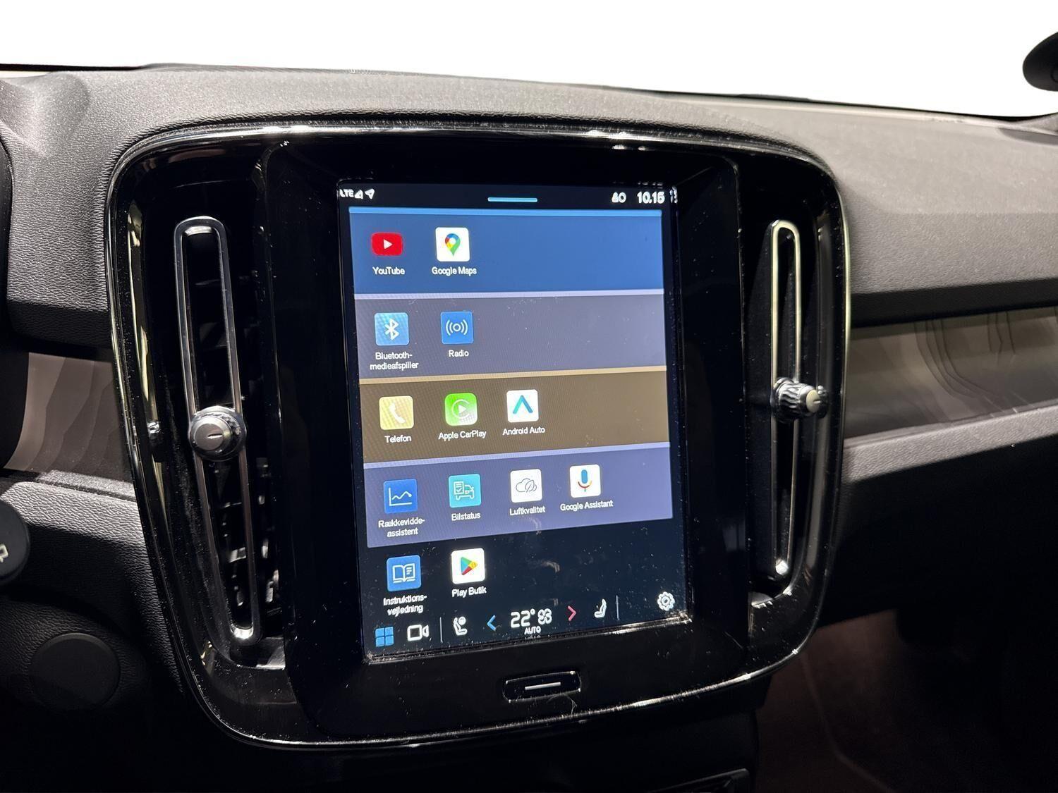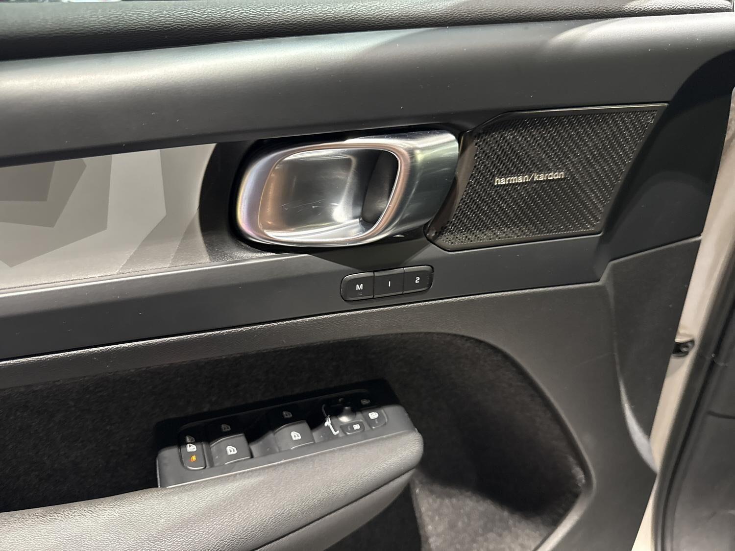 | Android Auto, Apple CarPlay, Aut. nedblændeligt bakspejl, Automatgear, Automatisk lys, Automatisk op-/nedblænding, Bakkamera, Bluetooth, Digital instrumentering, El indst. førersæde m. memory, El-bagklap med fodsensor, Elektrisk bagklap, El-foldbare spejle m. memory og varme, El-håndbremse, El-justerbar lændestøtte i forsæder, El-justerbart passagersæde, Elruder for/bag, El-spejle med varme, El-spejle, Fartpilot adaptiv, Fjernbetjent centrallås, Frontkamera, Fugtighedssensor, Harman Kardon anlæg, Håndfri telefon, Klimapakke, Internet, Klimaanlæg 2-zoner, Nøglefri adgang og håndfri åbning af bagklap, Nøglefri døre, Nøglefri start, One pedal drive, Opvarmede viskerblade, Panoramasoltag, Parkeringssensor for/bag, Regnsensor, Stemmebetjening, Sædevarme for, Travel Assist , Trådløs mobilopladning, Udvendig temperaturmåler, USB-C, Varmepumpe, Varme i rat, 19" Alufælge, Alufælge, Frunk, Fuld LED forlygter, LED baglygter, LED forlygter, LED forlygter med fjernlys assistent, Lygtevasker, LED Tågelygter foran, Sort tag , Tonede ruder, Tågelygter for/bag, Justerbart rat, Kopholder, Kunstlæder, Rat m. varme, Soltag, 360 graders kamera, Afstandsradar, AFU (Nødbremseassistance), Airbag, Alarm, Antispin, Aut.nedblændende bak- og sidespejle, Auto hold, Blindvinkelassistent, BLIS, Dæktrykssensor, ESP, Isofix, Kollisionsadvarsel, Lyssensor, Pilot Assist, Selealarm, Selestrammer, Real time traffic, Side-airbag, Sidekollisionsbeskyttelse, Skiltegenkendelse, Slippery Road Alert, Tyverialarm, Vejbaneassistent, Volvo On Cal |